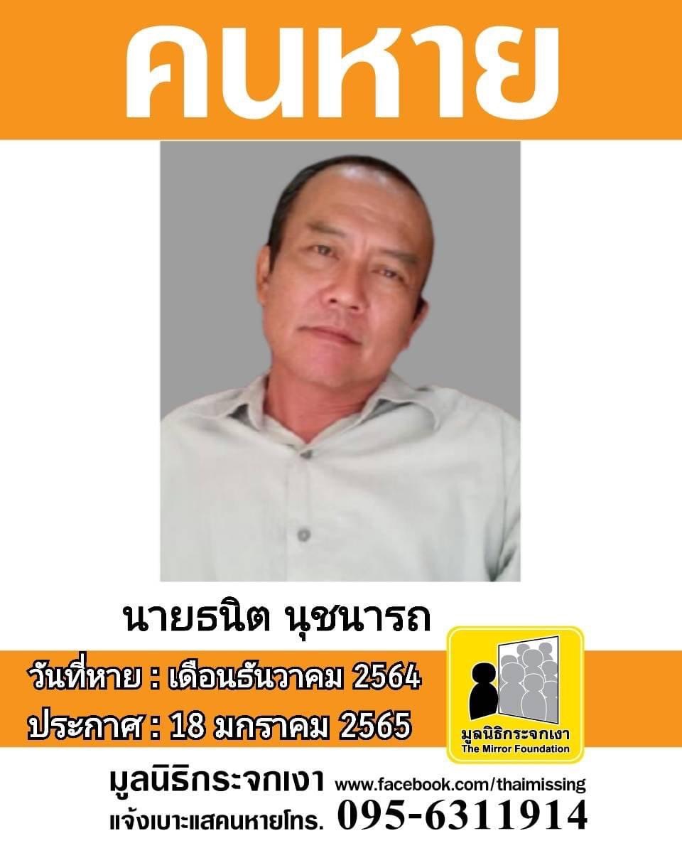 ชื่อ นายธนิต นุชนารถ หรือ นิด อายุ 57 ปี หายออกจากบริเวณโครงการบ้านเอื้ออาทร (นาจอมเทียน) ตำบลนาจอมเทียน อำเภอสัตหีบ จังหวัดชลบุรี เมื่อเดือนธันวาคม 2564
