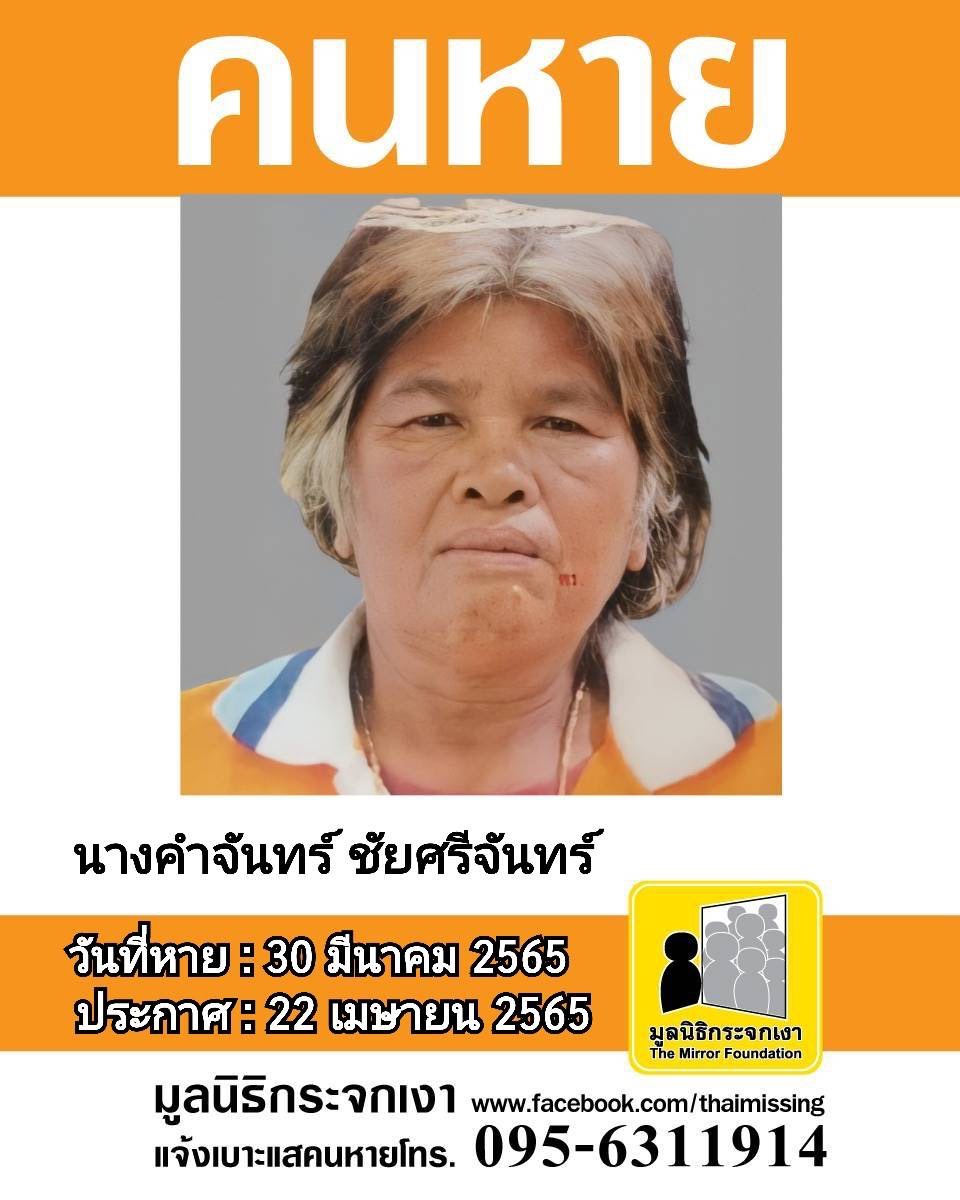 ชื่อ นางคำจันทร์ ชัยศรีจันทร์ หรือ จันทร์ อายุ 60 ปี หายออกจากบริเวณหมู่ที่ 8 ซอย 34 ตำบลบ้านลาด อำเภอบ้านลาด จังหวัดเพชรบุรี เมื่อวันที่ 30 มีนาคม 2565