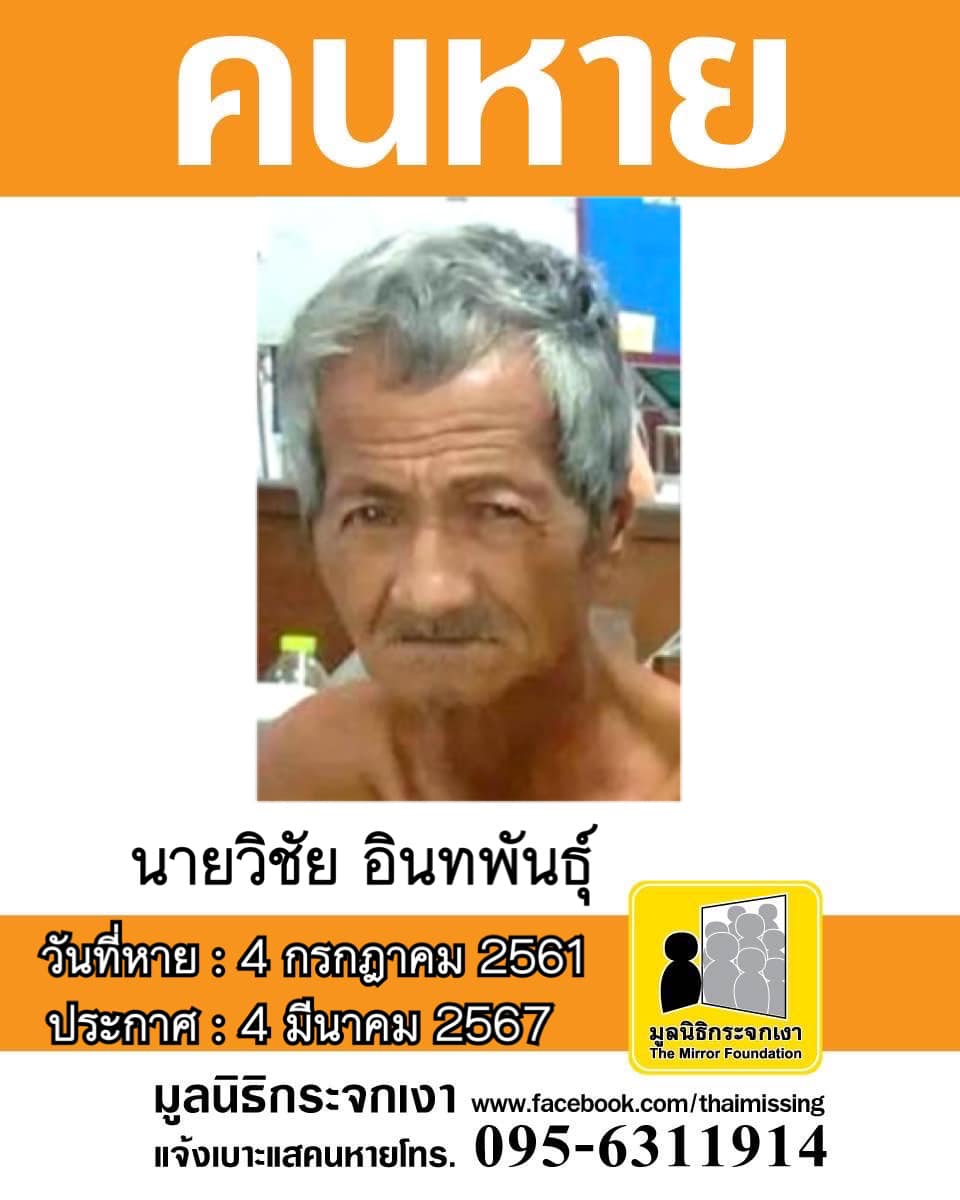 ชื่อ นายวิชัย อินทพันธุ์ อายุขณะหาย 70 ปี(อายุปัจจุบัน 75 ปี) หายออกจากบริเวณหมู่บ้านชัยพฤกษ์ ซอย 13 ตำบลหนองหอย อำเภอเมือง จังหวัดเชียงใหม่ เมื่อวันที่ 4 กรกฎาคม 2561 เวลาประมาณ 04.00 น.