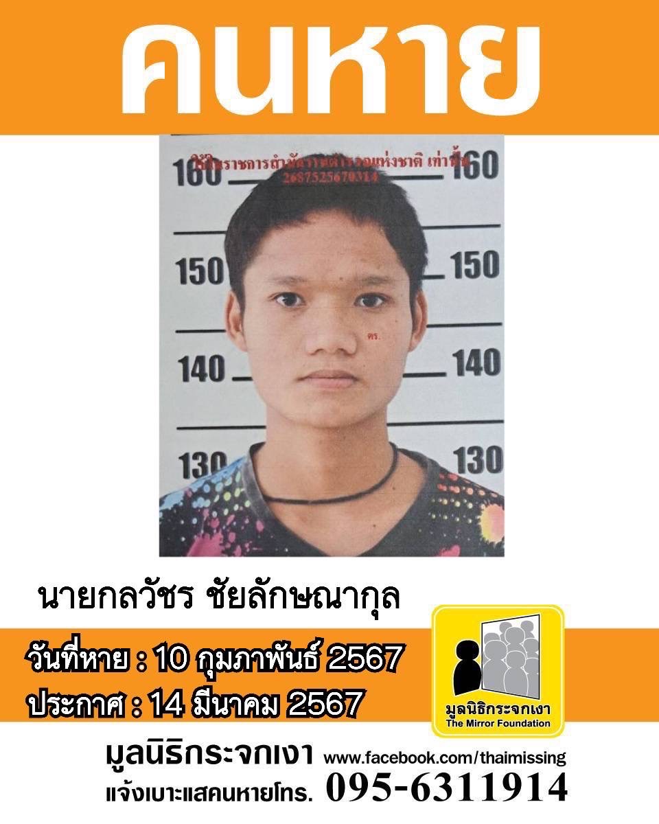 ชื่อ นายกลวัชร ชัยลักษณากุล หรือ นุนู อายุ 16 ปี หายออกจากบริเวณหมู่ที่ 4 ตำบลอุ้มผาง อำเภออุ้มผาง จังหวัดตาก เมื่อวันที่ 10 กุมภาพันธ์ 2567 เวลาประมาณ 06:00 น.