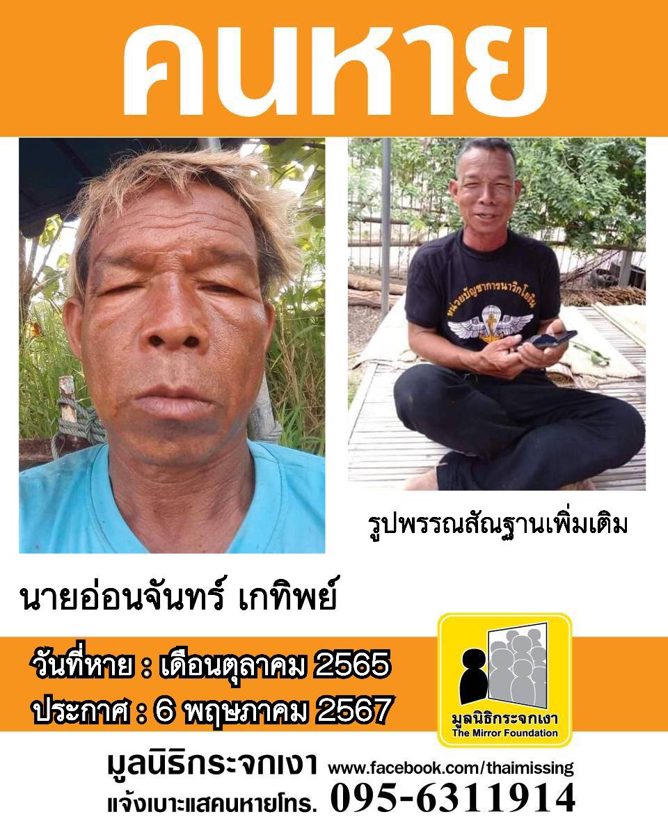 ชื่อ นายอ่อนจันทร์ เกทิพย์ หรือ เกลือ อายุขณะหาย 55 ปี (อายุปัจจุบัน 57 ปี) หายออกจากบริเวณหมู่ที่ 5 ตำบลรุ่งระวี อำเภอน้ำเกลี้ยง จังหวัดศรีษะเกษ เมื่อเดือนตุลาคม 2565