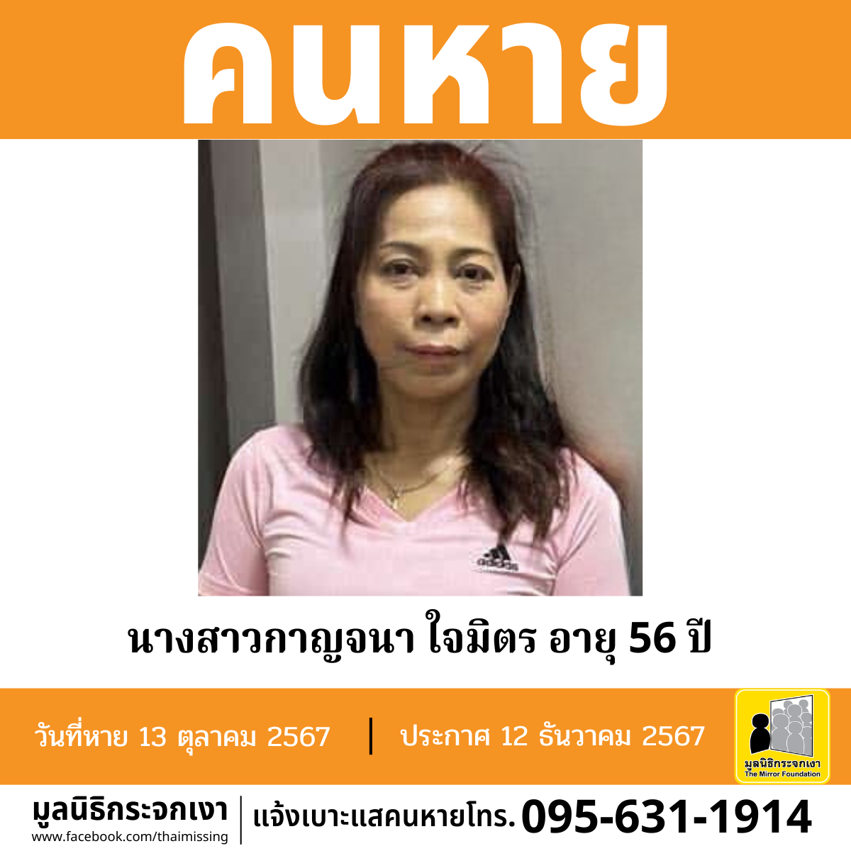 ชื่อ นางกาญจนา ใจมิตร หรือ นก อายุ 56 ปี หายออกจากบริเวณซอย 7 ถนนรัตนอุทิศ ตำบลหาดใหญ่ อำเภอหาดใหญ่ จังหวัดสงขลา เมื่อวันที่ 13 ตุลาคม 2567