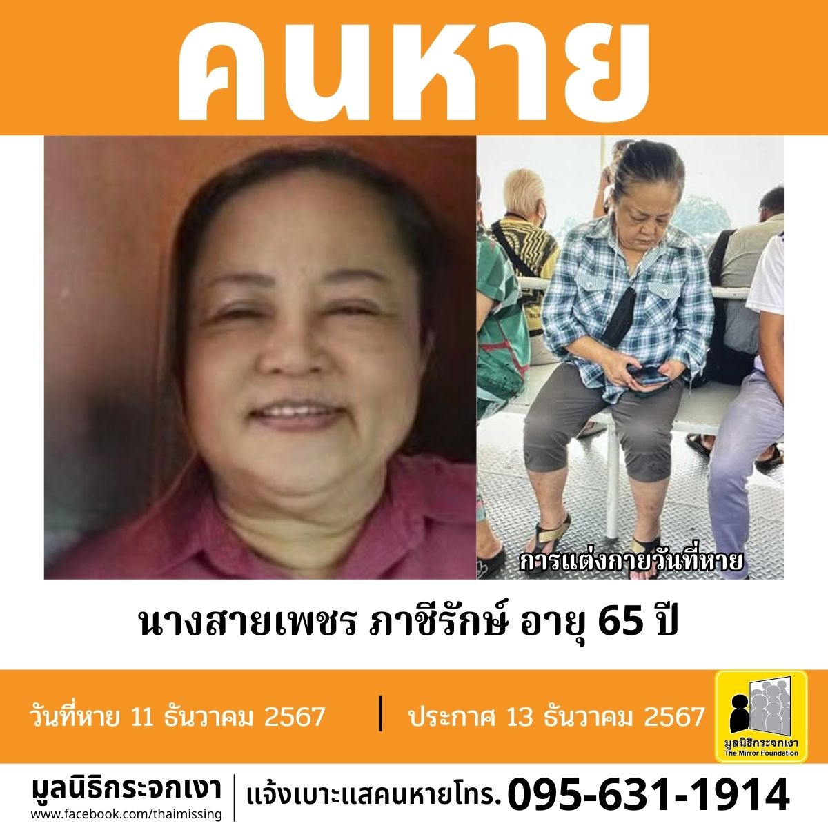 ชื่อ นางสายเพชร ภาชีรักษ์ หรือ กิม อายุ 65 ปี หายออกจากบริเวณซอยสุขสวัสดิ์ 26 แยก 2-1 แขวงบางปะกอก เขตราษฎร์บูรณะ กรุงเทพมหานคร เมื่อวันที่ 11 ธันวาคม 2567
