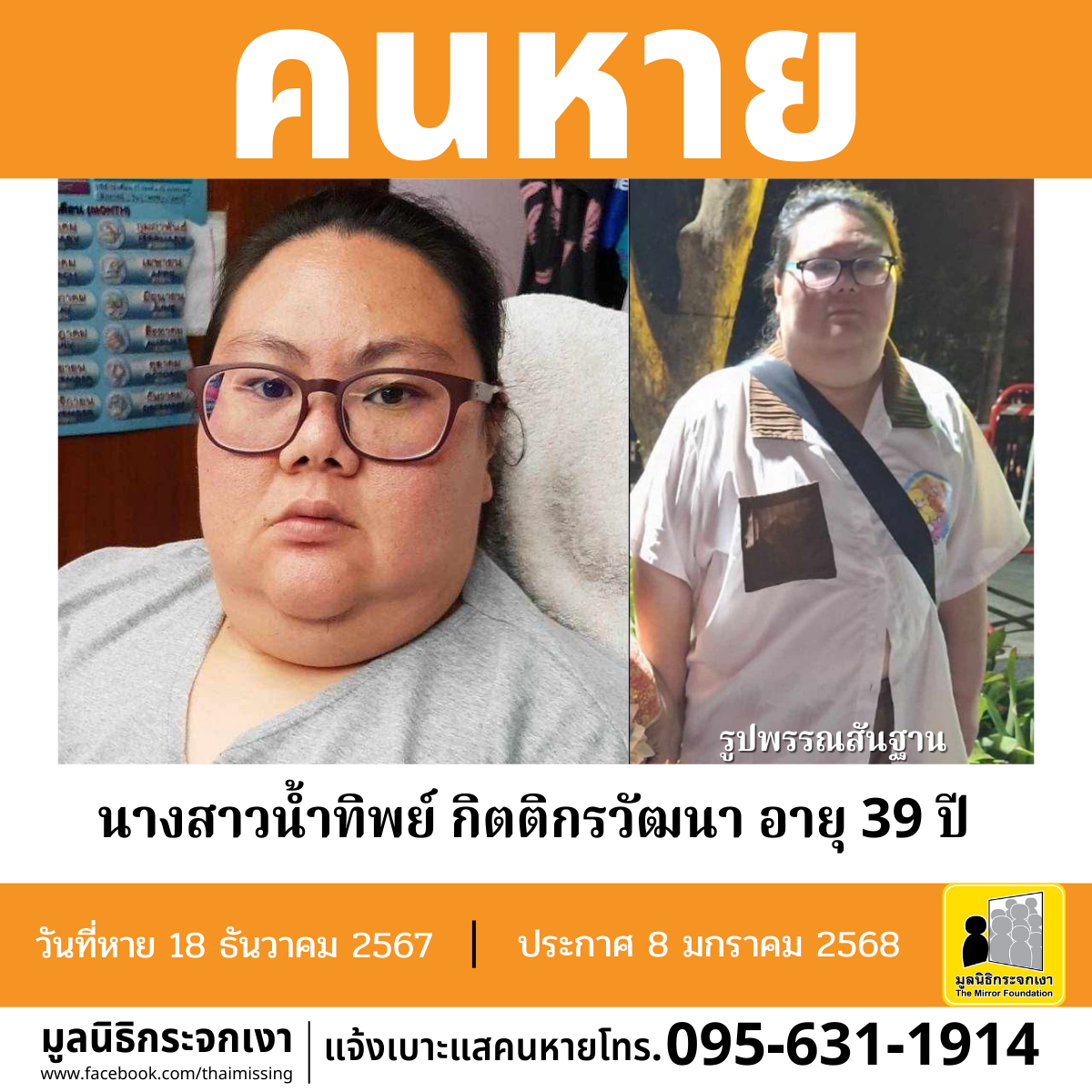 ผู้ใดพบเห็นโปรดแจ้งมูลนิธิกระจกเงา โทร. 095 631 1914