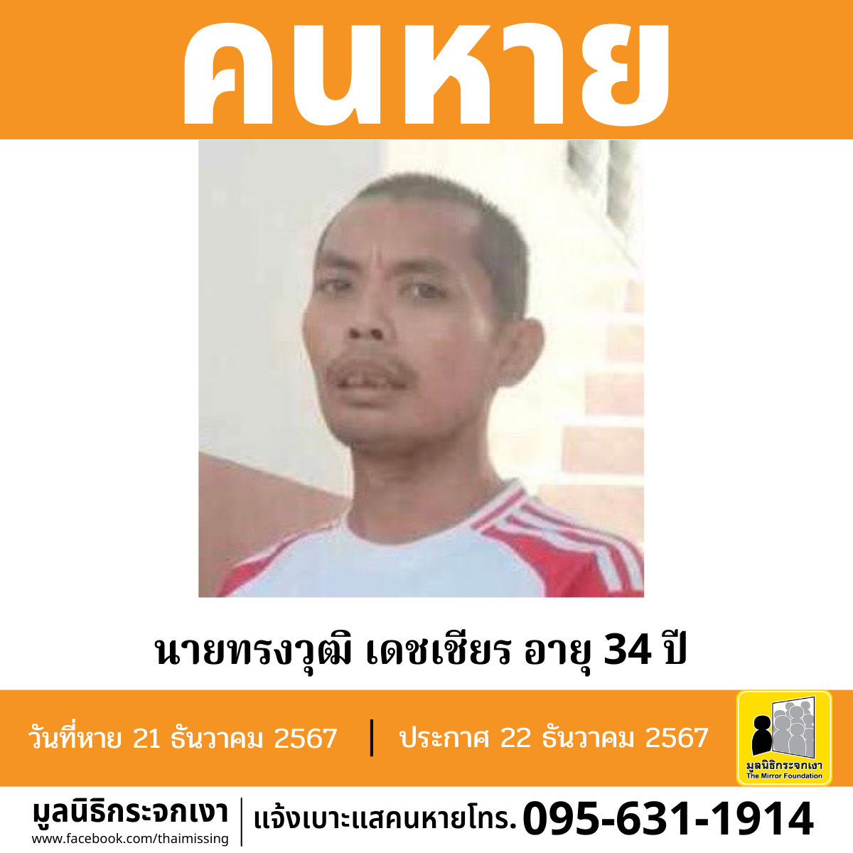 ผู้ใดพบเห็นโปรดแจ้งมูลนิธิกระจกเงา โทร. 095 631 1914