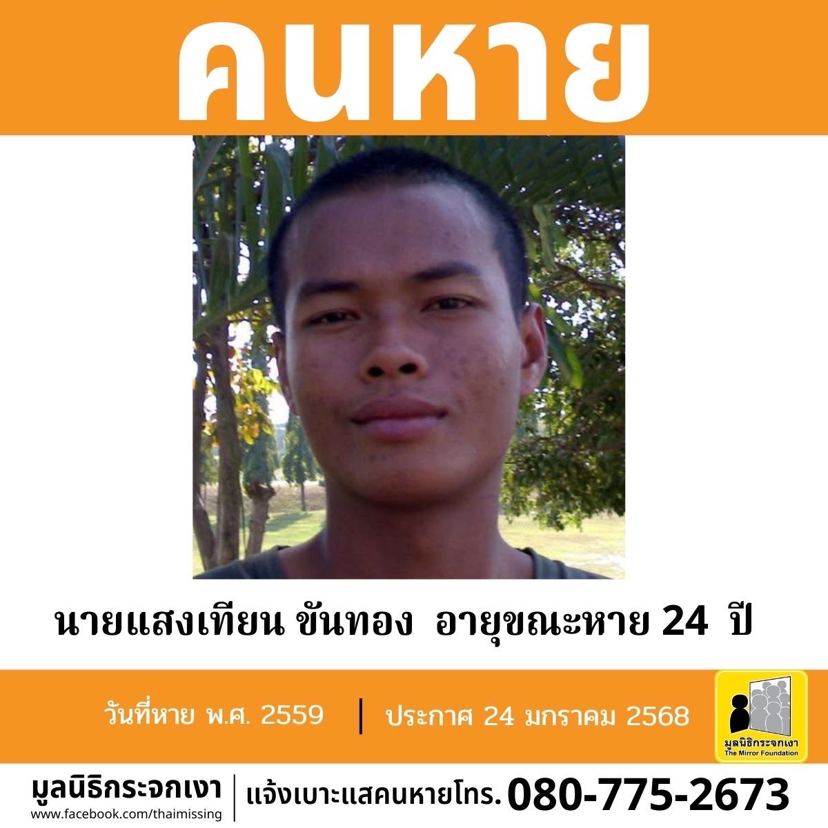 ผู้ใดพบเห็นโปรดแจ้งมูลนิธิกระจกเงา โทร. 080 775 2673