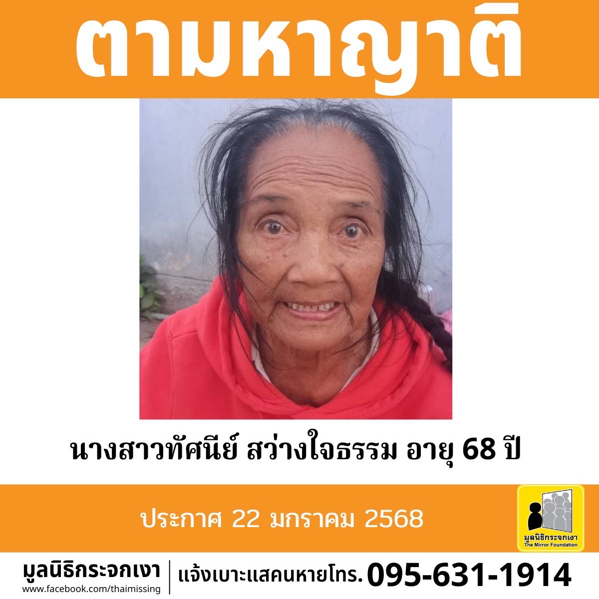 ทั้งนี้หากท่านใดเป็นญาติ หรือรู้จักกับหญิงในภาพ กรุณาติดต่อ ศูนย์ข้อมูลคนหาย มูลนิธิกระจกเงา โทร 095 631 1914