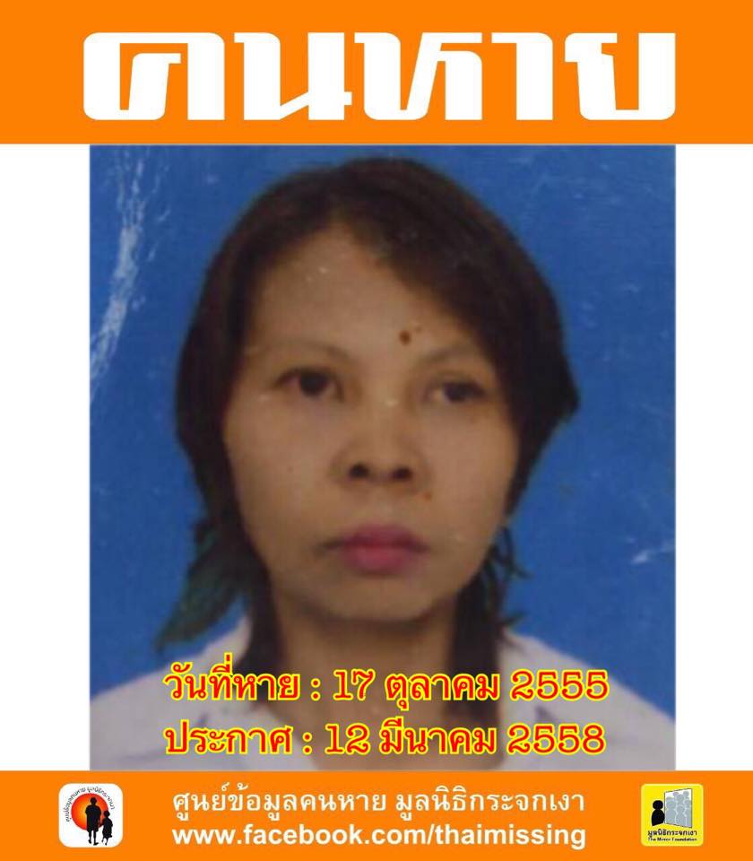 คนหาย !!!ชื่อ นางสาวสนม วัฒนพันธ์ อายุขณะหาย 39 ปี(อายุปัจจุบัน 49 ปี) หายออกจากบริเวณหมู่ที่ 2 ตำบลบุกระสัง อำเภอหนองกี่ จังหวัดบุรีรัมย์ เมื่อวันที่ 17 ตุลาคม 2555 คนหายรูปร่างผอม สูงประมาณ 160 ซม. ผิวคล้ำ ผมสั้น ผมสีดำ จุดสังเกตคนหายตาข้างซ้ายบอด