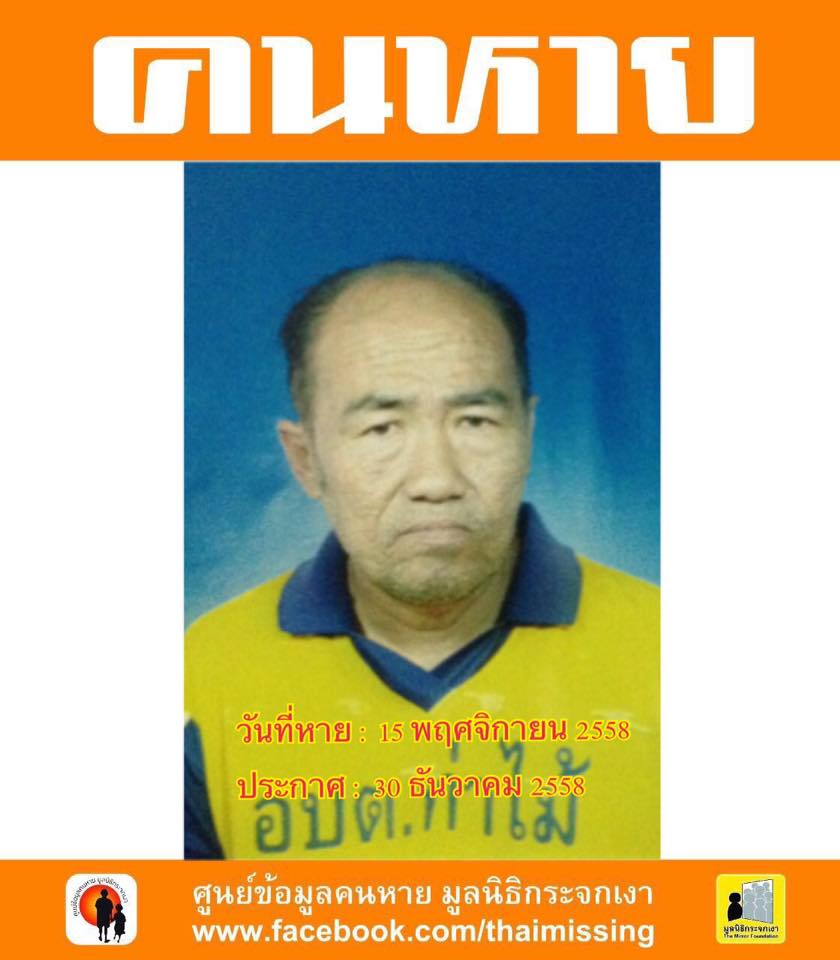 คนหาย !!! ชื่อคุณชัชวาลย์ สร้อยสนไพบูลย์ หรือชัชวาล อายุ 53 ปี รูปร่างท้วม สูงประมาณ 165 ซม. ผิวขาว ผมบาง หายออกจากบ้านอ. กระทุ่มแบน จ.สมุทรสาคร ตั้งแต่วันที่ 15 พฤศจิกายน 2558