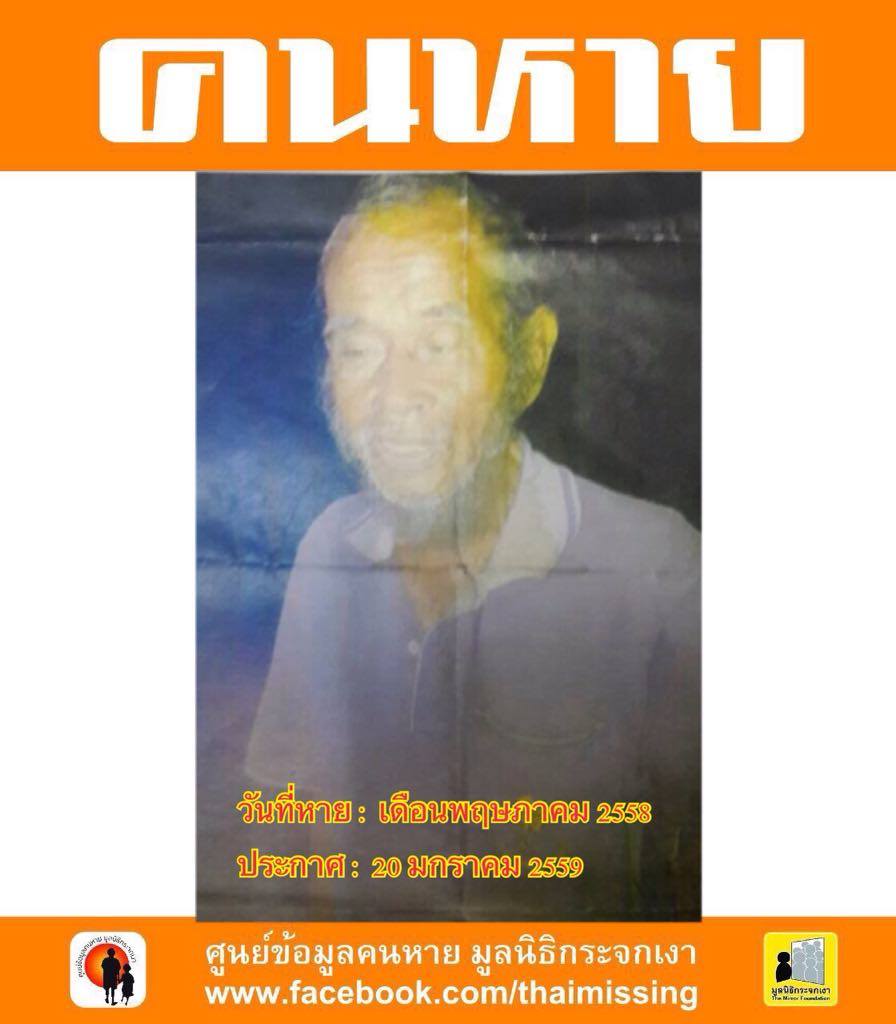 คนหาย !!! ชื่อคุณละออ แก้วถมยา อายุ 79 ปี รูปร่างสมส่วน สูงประมาณ 160 ซม. ผิวคล้ำ ผมสั้นสีดำแซมขาว มีหนวดเคราสีขาว หายออกจากบ้านบริเวณหน้าธนาคารกรุงเทพ ตรงข้ามกับการไฟฟ้าบางกรวย ถนนสะพานพระราม 7 อำเภอบางกรวย จ.นนทบุรี ตั้งแต่เดือน พฤษภาคม 2558