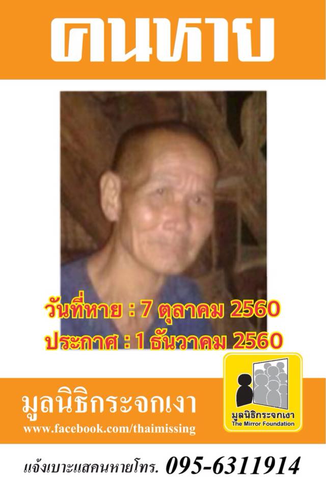 ชื่อ คุณพุฒ อินไชย อายุ 64 ปี ได้หายออกจากบริเวณวัดถ้ำผากล้วย ตำบลแม่เมาะ อำเภอแม่เมาะ จังหวัดลำปาง เมื่อวันที่ 7 ตุลาคม 2560