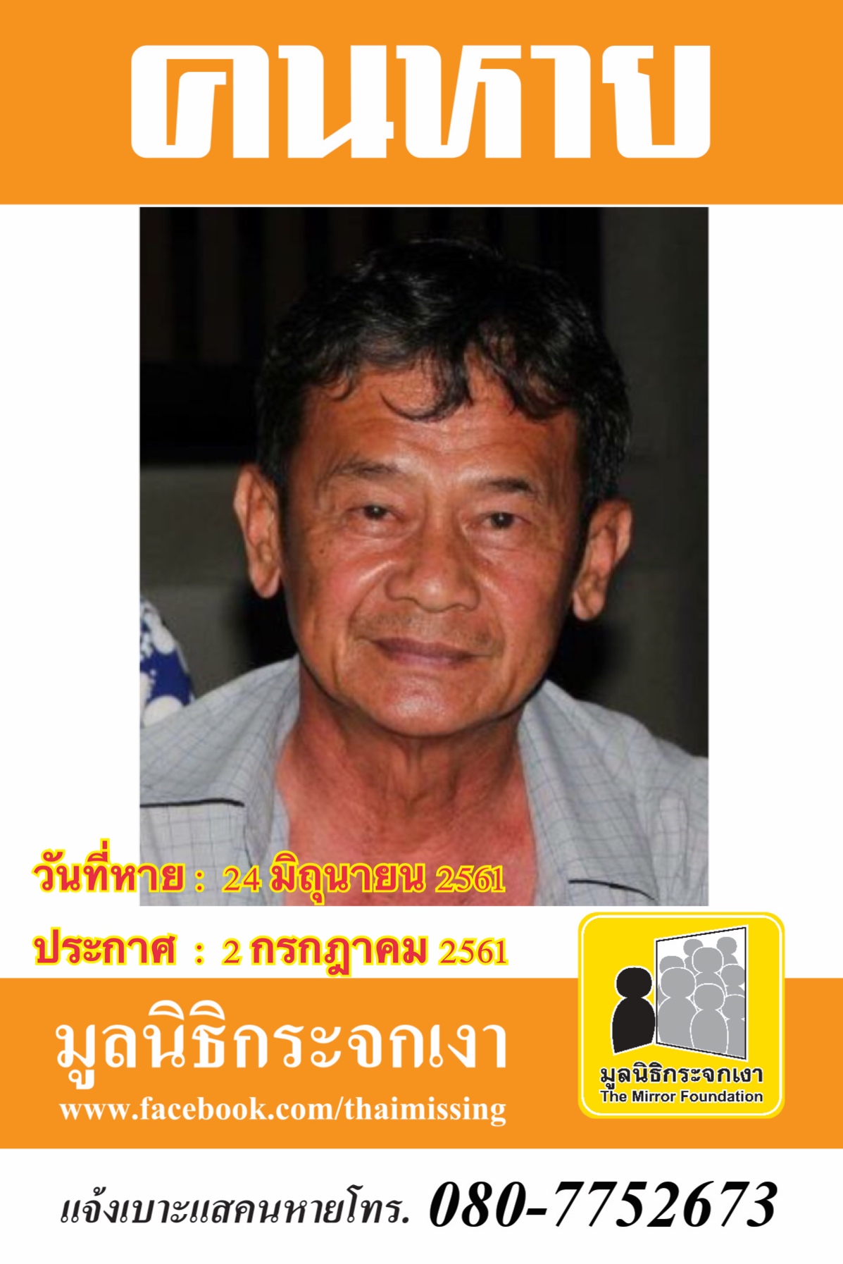 ผู้ใดพบเห็นโปรดแจ้งมูลนิธิกระจกเงา โทร 080-775-2673