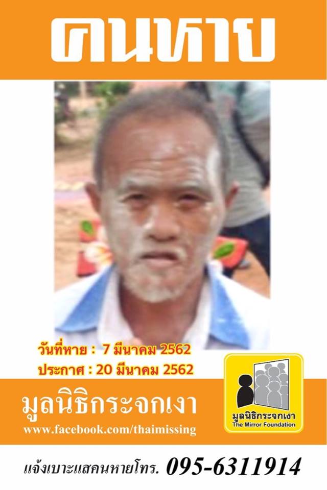 คนหาย !!!ชื่อ นายพรม พันธโนราช หรือ อ่อน อายุ 51 ปี ได้หายออกจากบริเวณหมู่ที่ 9 บ้านคลองปาโด ตำบลท่าแยก อำเภอเมืองสระแก้ว จังหวัดสระแก้ว เมื่อวันที่ 7 มีนาคม 2562 เวลาประมาณ 10.00 น.คนหาย รูปร่างอ้วน สูงประมาณ 150 ซม. ผิวสีดำ-แดง ลักษณะผมสั้น สีผมดำ-ขาว การแต่งกายสวมเสื้อยืดสีส้ม สวมกางเกงกีฬาขาสั้นสีฟ้าคราม ไม่สวมรองเท้า