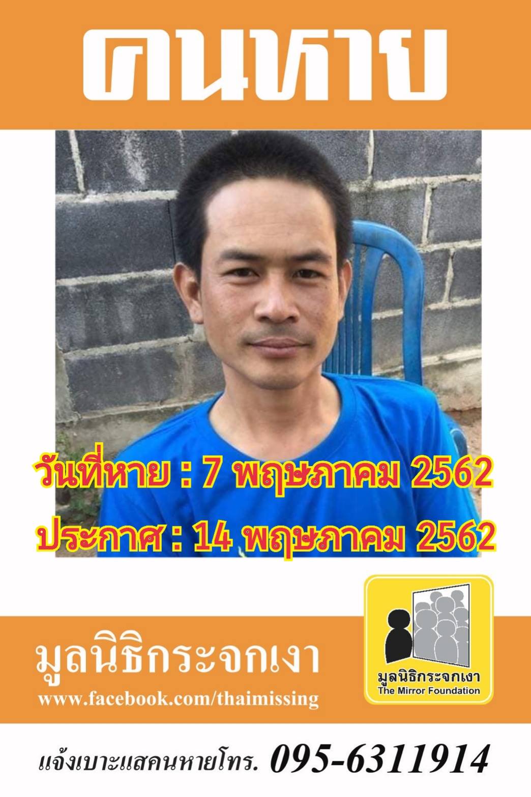 คนหาย สูงประมาณ 160 ซม. น้ำหนัก 52 กก. ผิวสองสี ลักษณะผมสั้น สีผมดำ มีตำหนิรอยสักที่หัวไหล่ นิ้วหัวแม่มือขาด 1 ข้าง ไม่ทราบลักษณะการแต่งกาย