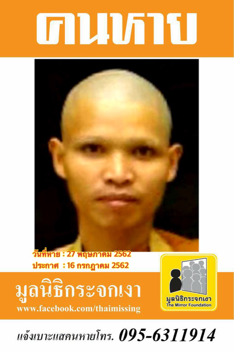 คนหาย รูปร่างผอม สูงประมาณ 170 ซม. น้ำหนักประมาณ 53 กก.ผิวสีแทน ลักษณะผมโกนศีรษะ มีรอยสักที่หัวไหล่ทั้ง 2 ข้างและมีรอยแผลเป็นที่แขนซ้าย การแต่งกายสวมจีวรพระสีเหลือง