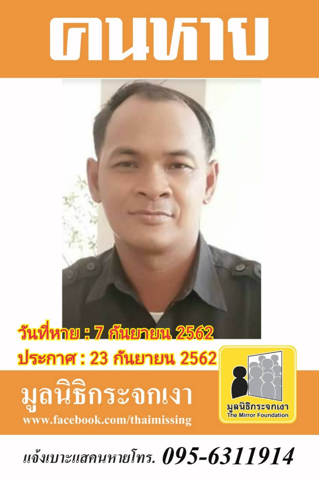 ผู้ใดพบเห็นโปรดแจ้งมูลนิธิกระจกเงา โทร. 095 631 1914