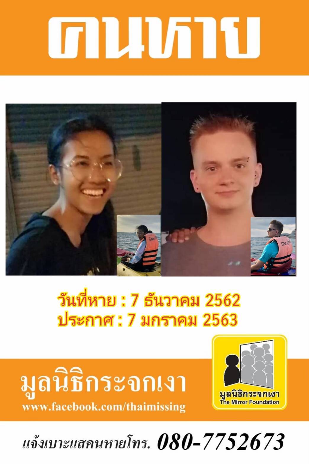 ผู้ใดพบเห็นโปรดแจ้งมูลนิธิกระจกเงา โทร. 080 775 2673