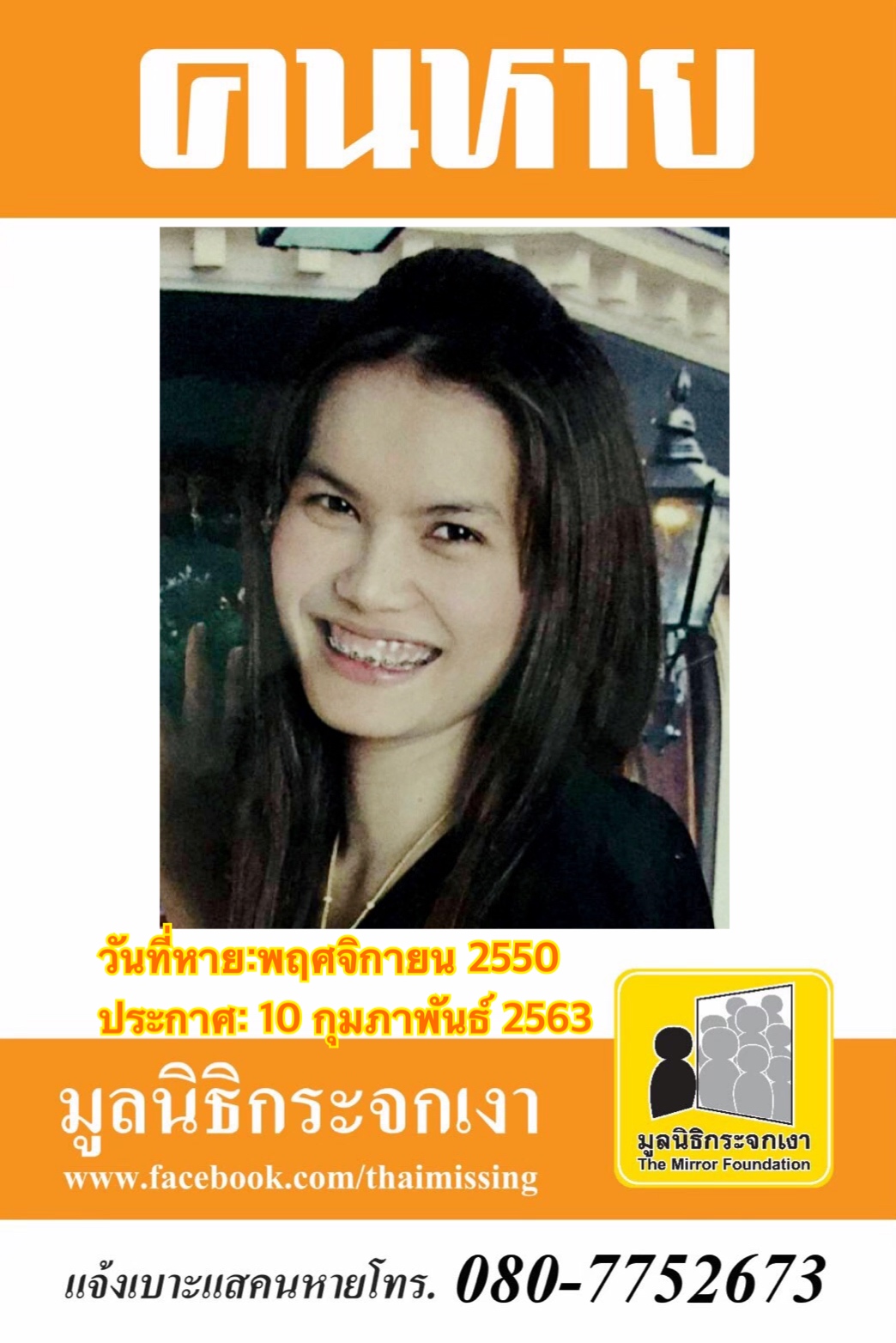 ผู้ใดพบเห็นโปรดแจ้งมูลนิธิกระจกเงา โทร. 080-775-2673