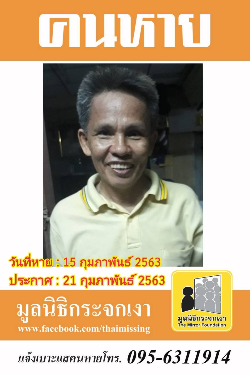ผู้ใดพบเห็นโปรดแจ้งมูลนิธิกระจกเงา โทร. 095 631 1914