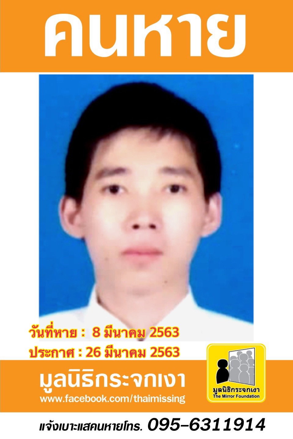 ผู้ใดพบเห็นโปรดแจ้งมูลนิธิกระจกเงา โทร. 095 631 1914