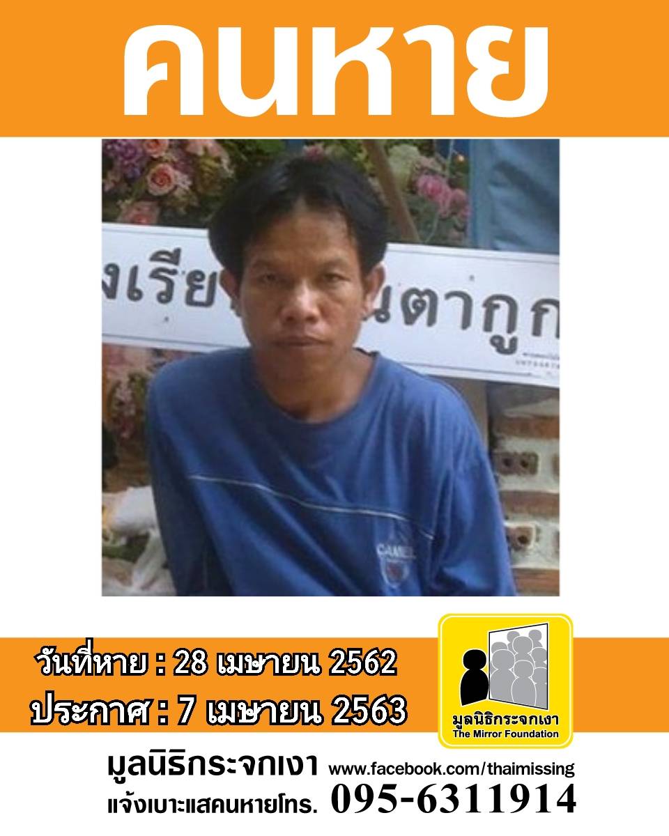 คนหาย สูงประมาณ 162 ซม. น้ำหนัก 50 กก. ผิวคล้ำ ลักษณะผมสั้น ผมสีดำ การแต่งกายสวมกางเกงขาสั้นตัวเดียว มีตำหนิรอยแผลเป็นจากตุ่มน้ำเหลืองไม่ดีตามร่างกาย