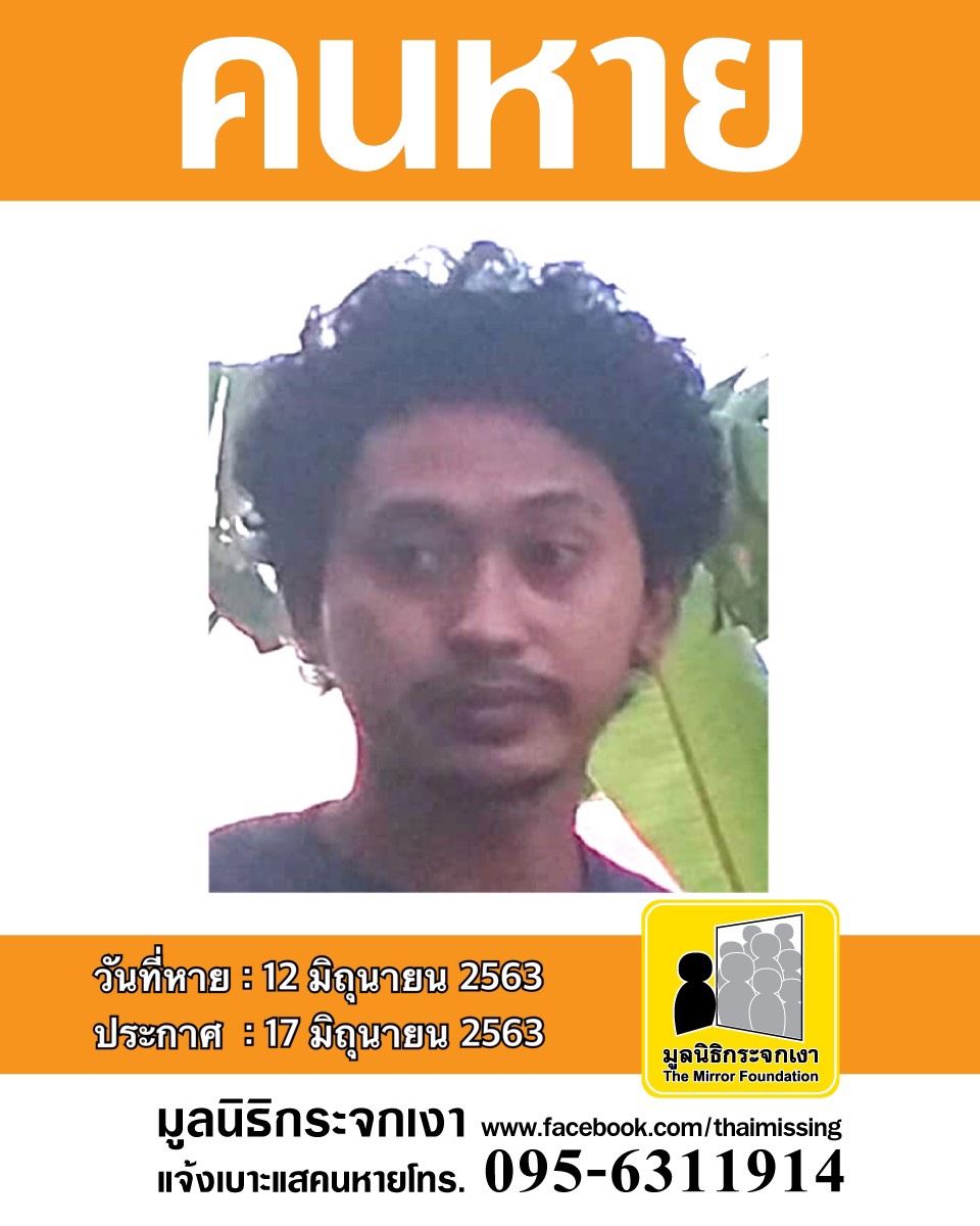 คนหาย สูงประมาณ 178 ซม. น้ำหนักประมาณ 80 กก. ผิวสีขาว-เหลือง ลักษณะผมสั้น ผมสีดำ มีรอยแผลเป็นตามร่างกาย การแต่งกายสวมเสื้อยืดสีดำมีลายสกรีนด้านหลังสีเหลือง สวมกางเกงขาสามส่วนสีเขียวขี้ม้า สวมรองเท้าแตะหนีบสีดำสายคาดสีส้ม