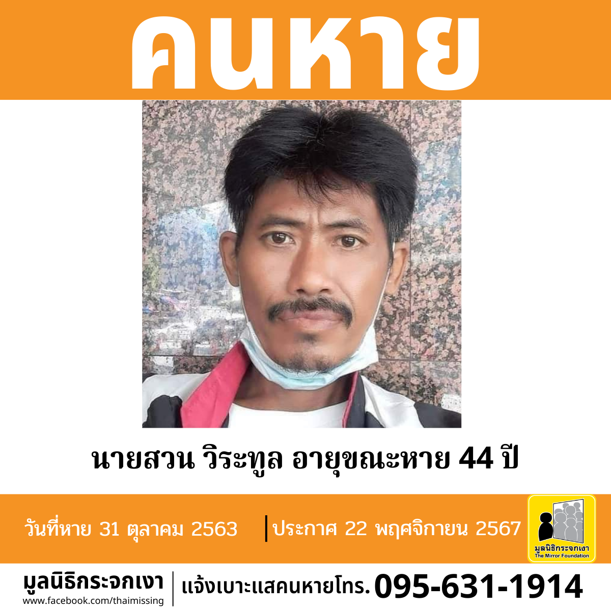 ผู้ใดพบเห็นโปรดแจ้งมูลนิธิกระจกเงา โทร. 095 631 1914