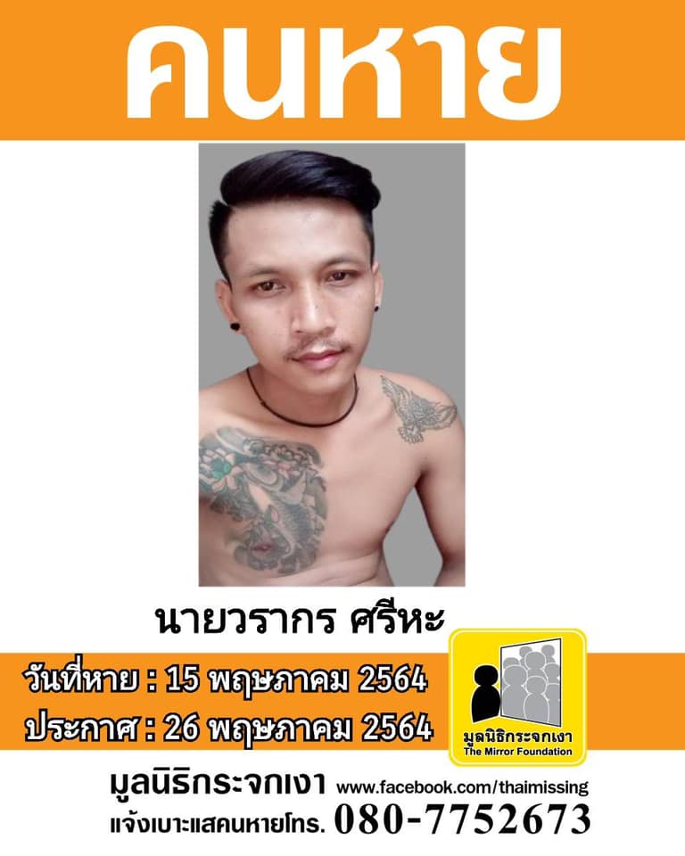 ชื่อ นายวรากร ศรีหะ หรือ หวอ อายุ 29 ปี ได้หายจากบริเวณบ้านเขาน้อย ตำบลหนองสาหร่าย อำเภอปากช่อง จังหวัดนครราชสีมา เมื่อวันที่ 15 พฤษภาคม 2564 เวลาประมาณ 12 : 00 น.
