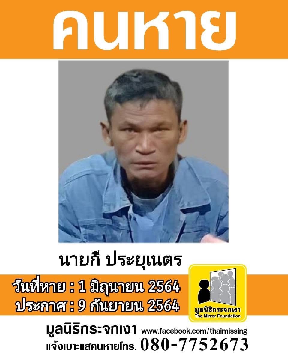 คนหาย !!!ชื่อ นายกี ประยุเนตร หรือ งอ อายุ 52 ปี หายออกจากบริเวณตลาดวรจักร ซอยตรอกหิรัญ แขวงบ้านบาตร เขตป้อมปราบศัตรูพ่าย จังหวัดกรุงเทพมหานคร เมื่อวันที่ 1 มิถุนายน 2564