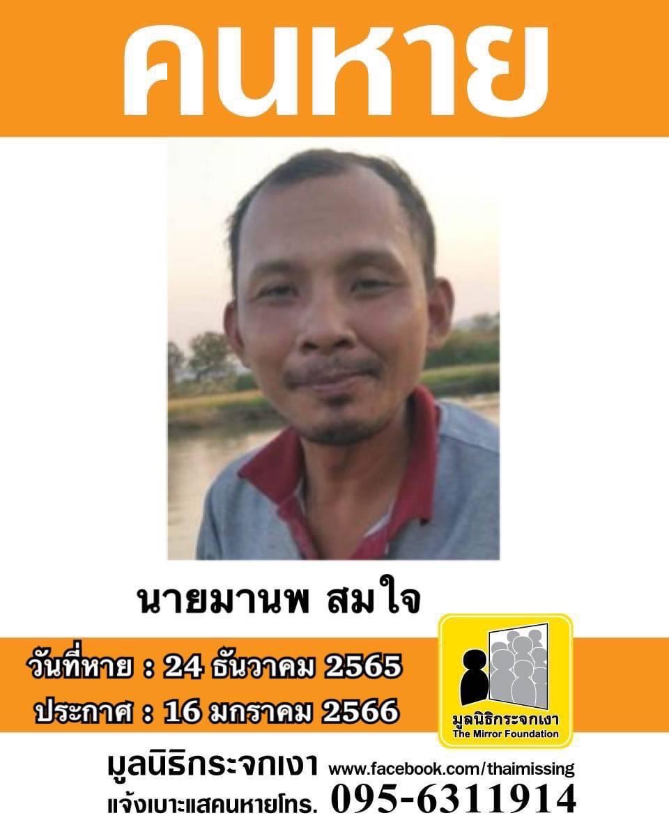 ชื่อ นายมานพ สมใจ หรือ ตั้ง อายุ 43 ปี หายออกจากบริเวณหมู่ที่ 1 ตำบลเขาน้อย อำเภอท่าม่วง จังหวัดกาญจนบุรี เมื่อวันที่ 24 ธันวาคม 2565