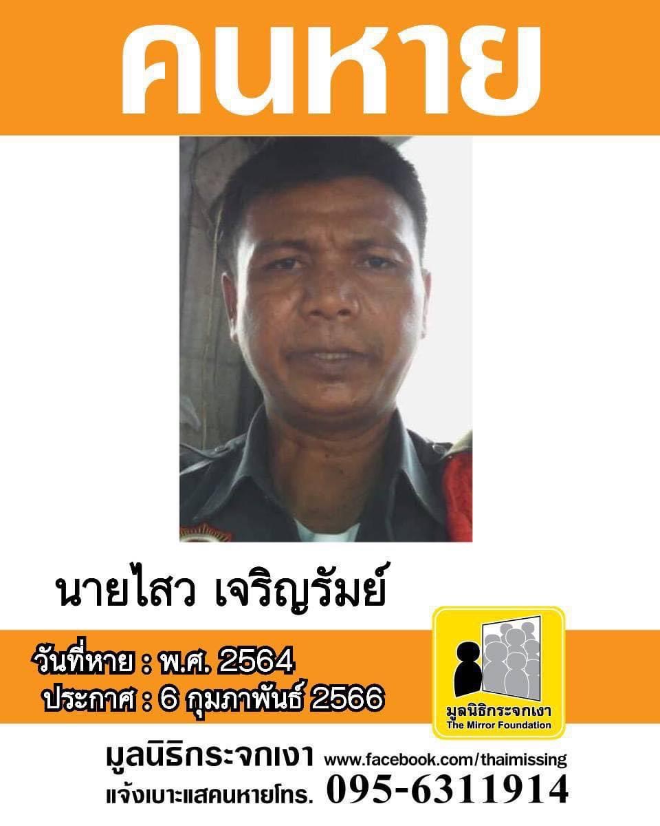 ชื่อ นายไสว เจริญรัมย์ หรืองบ อายุขณะหาย 47 ปี(อายุปัจจุบัน 49 ปี) หายออกจากบริเวณจังหวัดนครปฐม เมื่อ พ.ศ. 2564