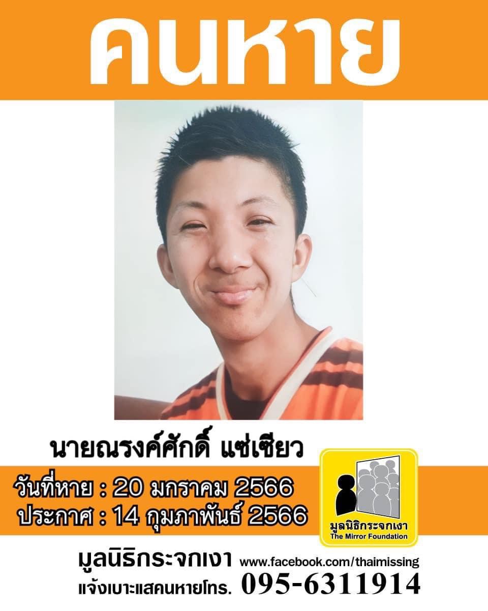 คนหายรูปร่างผอม สูงประมาณ 175 ซม. น้ำหนักประมาณ 46 กก. ผิวดำแดง ผมสั้น ผมสีดำ สวมเสื้อฮู้ดแขนยาวสีเขียว สวมกางเกงยีนส์ขายาว สวมรองเท้าผ้าใบ