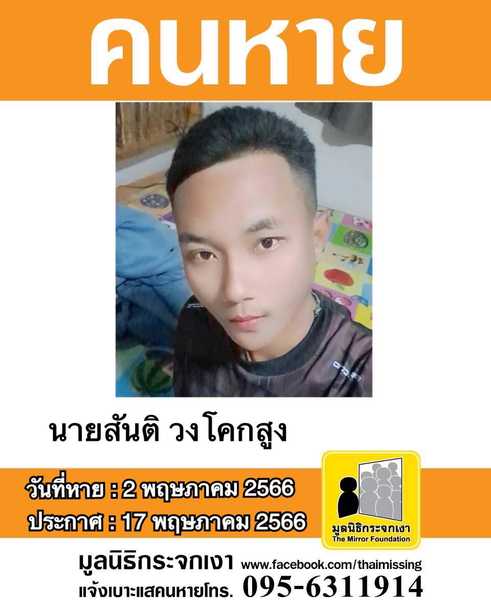 ชื่อ นายสันติ วงโคกสูง หรือ อาร์ม อายุ 24 ปี หายออกจากบริเวณซอยจอมเทียน 7 ตำบลหนองปรือ อำเภอบางละมุง จังหวัดชลบุรี เมื่อวันที่ 2 พฤษภาคม 2566 เวลาประมาณ 23:00 น.