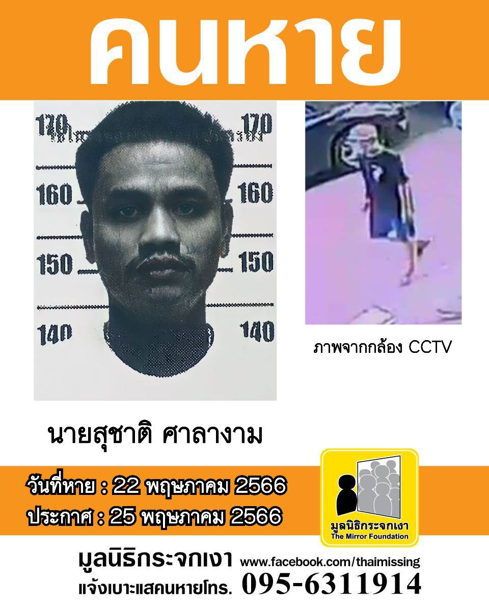 ชื่อ นายสุชาติ ศาลางาม หรือ แปด อายุ 39 ปี หายออกจากบริเวณซอยเพชรเกษม 106 แขวงหนองค้างพลู เขตหนองแขม จังหวัดกรุงเทพมหานคร เมื่อวันที่ 22 พฤษภาคม 2566 เวลาประมาณ 07:00 น.
