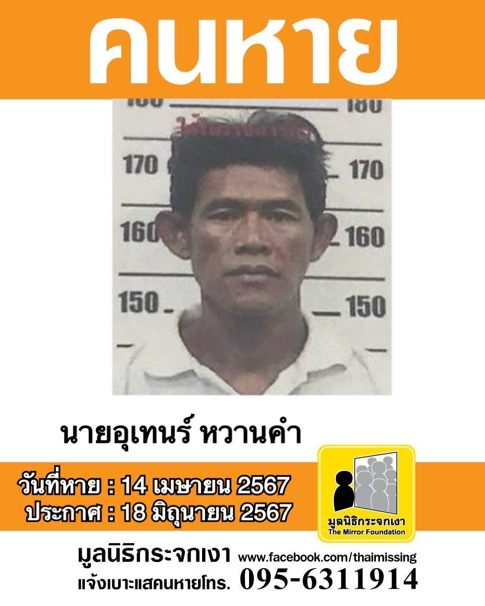 ชื่อ นายอุเทนร์ หวานคำ หรือ ดวง อายุ 48 ปี หายออกจากบริเวณตลาดนัดกีบหมู แขวงบางชัน เขตคลองสามวา จังหวัดกรุงเทพมหานคร เมื่อวันที่ 14 เมษายน 2567