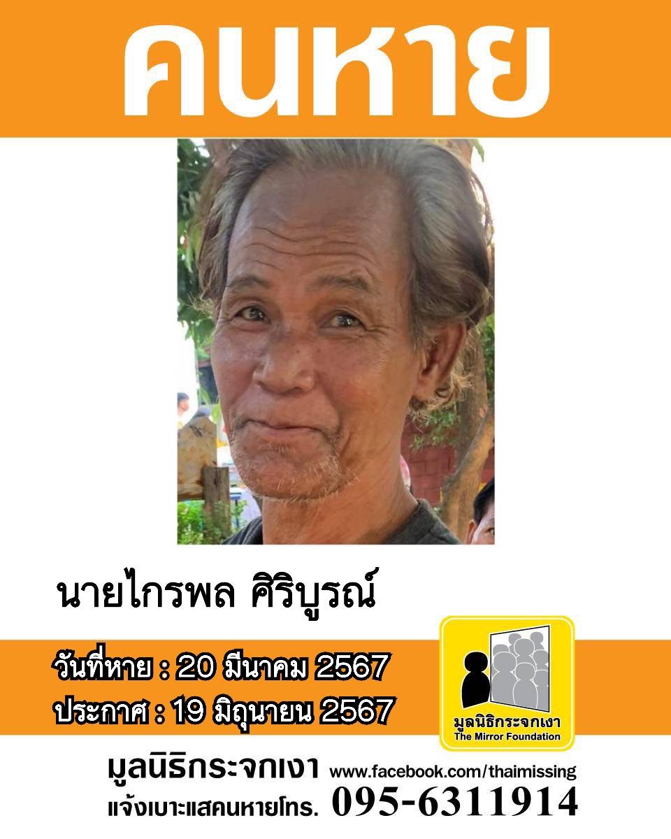 ชื่อ นายไกรพล ศิริบูรณ์ หรือ ลี อายุ 61 ปี หายออกจากบริเวณถนนพระราม 2 ซอย 60 แขวงแสมดำ เขตบางขุนเทียน กรุงเทพมหานคร เมื่อวันที่ 20 มีนาคม 2567