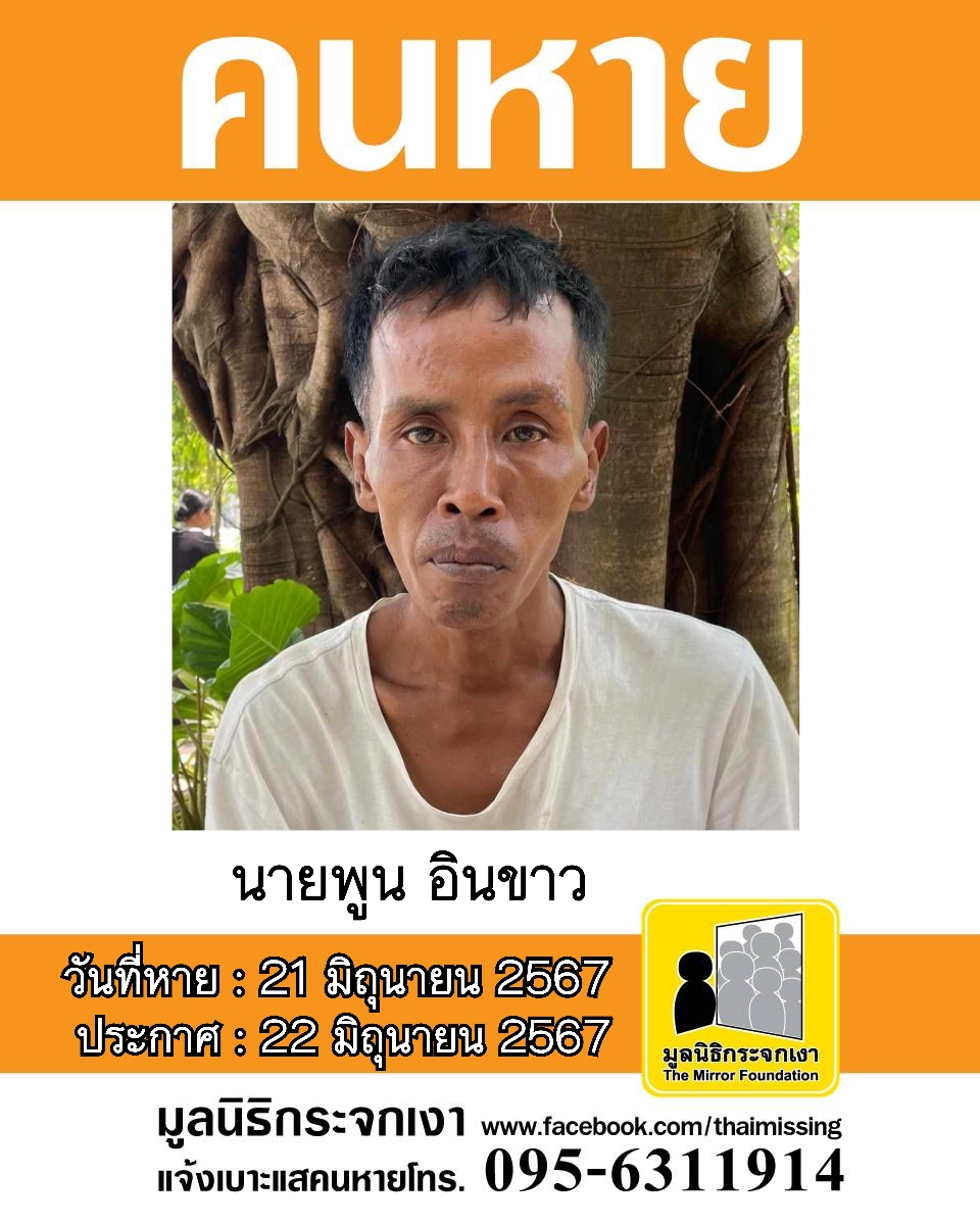 ชื่อ นายพูน อินขาว หรือพูน อายุ 47 ปี หายออกจากบริเวณหมู่ที่ 2 ตำบลบ้านมุง อำเภอเนินมะปราง จังหวัดพิษณุโลก เมื่อวันที่ 21 มิถุนายน 2567 เวลาประมาณ 20.00 น.
