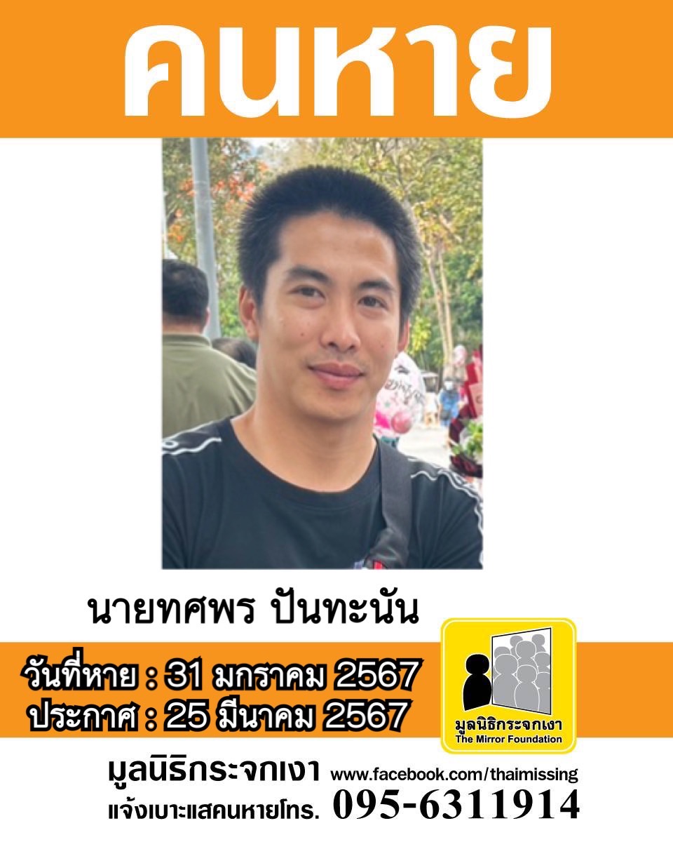 ชื่อ นายทศพร ปันทะนัน หรือ เจ อายุ 33 ปี หายออกจากบริเวณหมู่ที่ 15 ตำบลสันทราย อำเภอฝาง จังหวัดเชียงใหม่ เมื่อวันที่ 31 มกราคม 2567