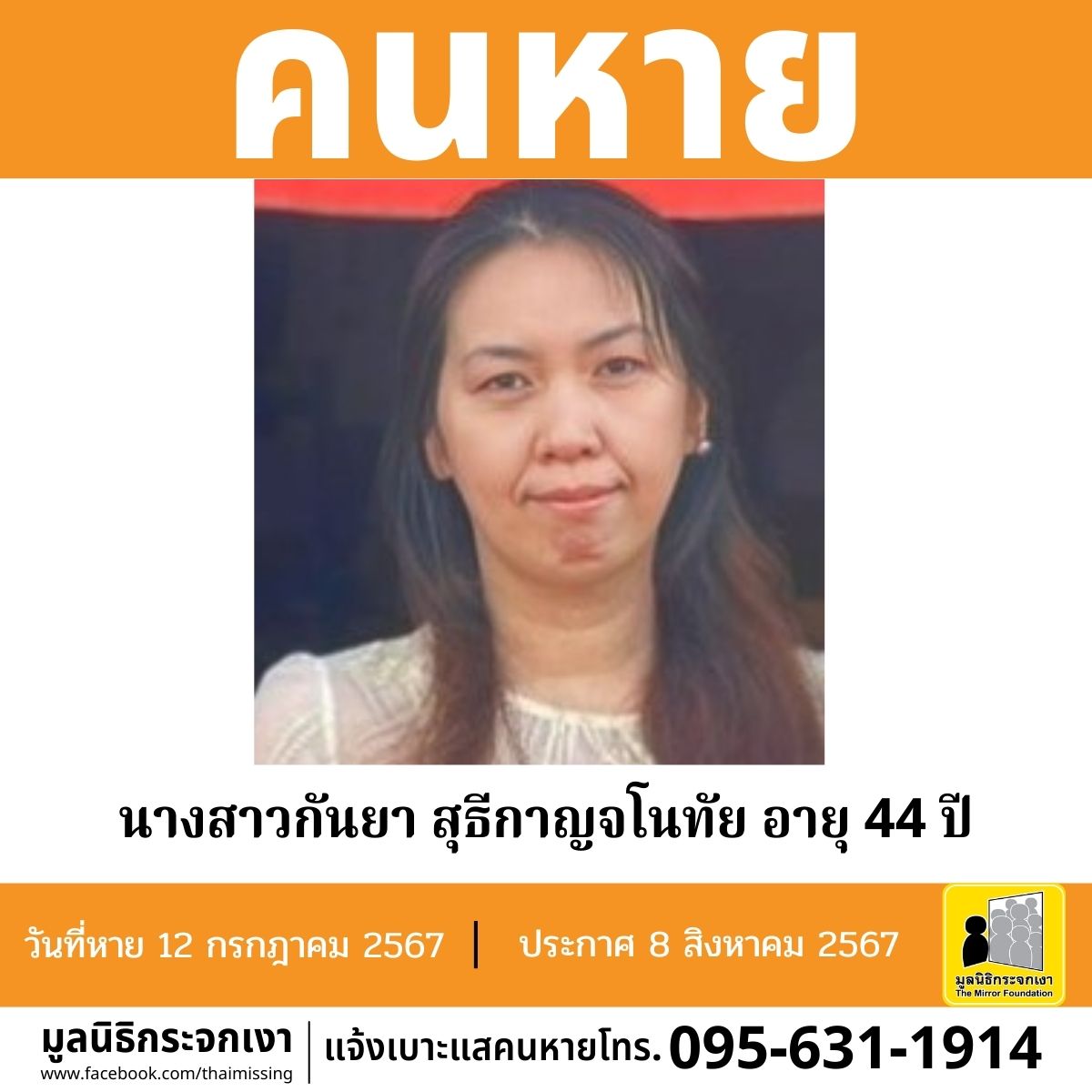 ชื่อ นางสาวกันยา สุธีกาญจโนทัย หรือ จุ๋ม อายุ 44 ปี หายออกจากบริเวณหมู่ที่ 4 ตําบลเชิงทะเล อําเภอถลาง จังหวัดภูเก็ต เมื่อวันที่ 12 กรกฎาคม 2567 เวลาประมาณ 20:00 น.