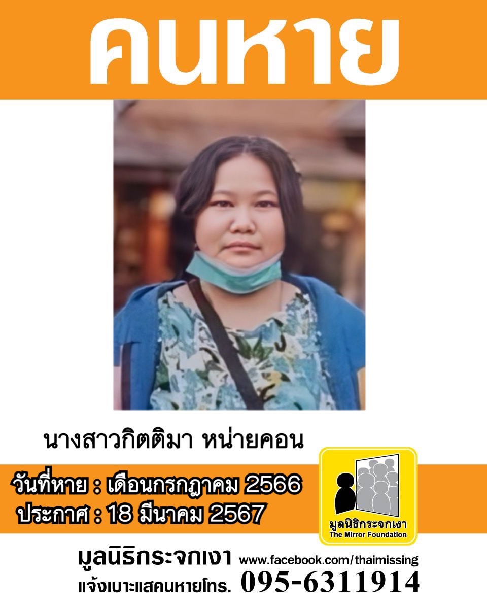 ชื่อ นางสาวกิตติมา หน่ายคอน หรือ มะเหมี่ยว อายุ 42 ปี หายออกจากบริเวณหมู่ที่ 3 ตำบลบ้านฉาง อำเภอบ้านฉาง จังหวัดระยอง เมื่อเดือนกรกฎาคม 2566
