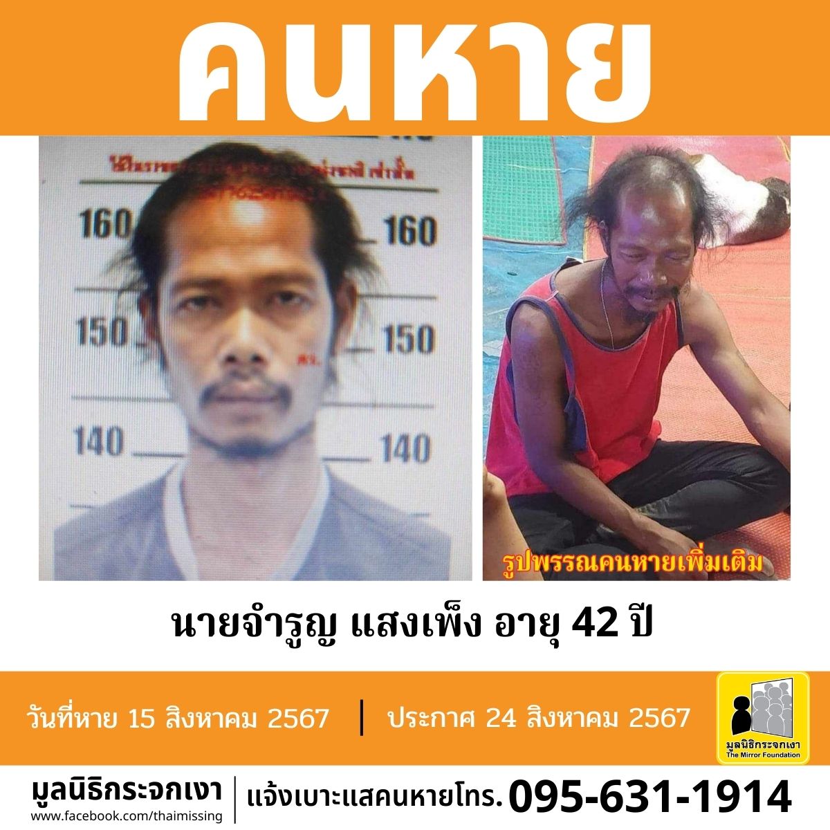 ผู้ใดพบเห็นโปรดแจ้งมูลนิธิกระจกเงา โทร. 095 631 1914