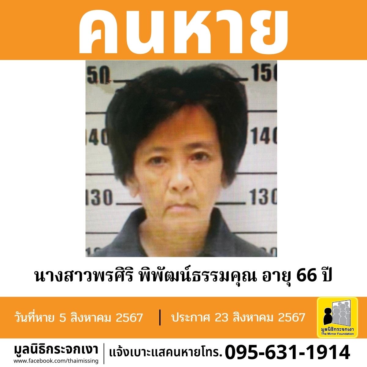 ผู้ใดพบเห็นโปรดแจ้งมูลนิธิกระจกเงา โทร. 095 631 1914