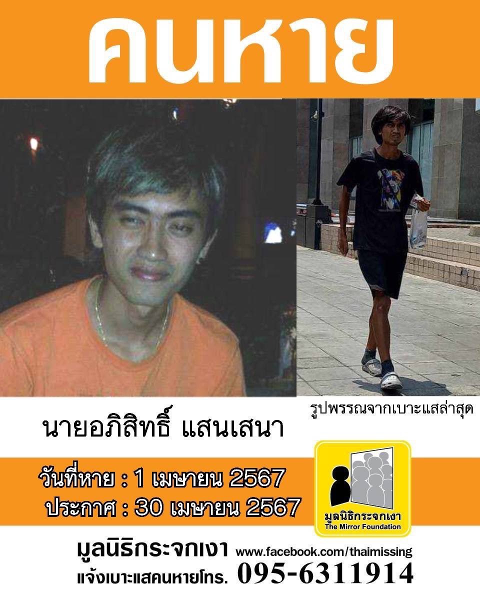 ชื่อ นายอภิสิทธิ์ แสนเสนา หรือ ฟลุ๊ค อายุ 28 ปี หายออกจากบริเวณชุมชนพัฒนาใหม่ แขวงคลองเตย เขตคลองเตย กรุงเทพมหานคร เมื่อวันที่ 1 เมษายน 2567