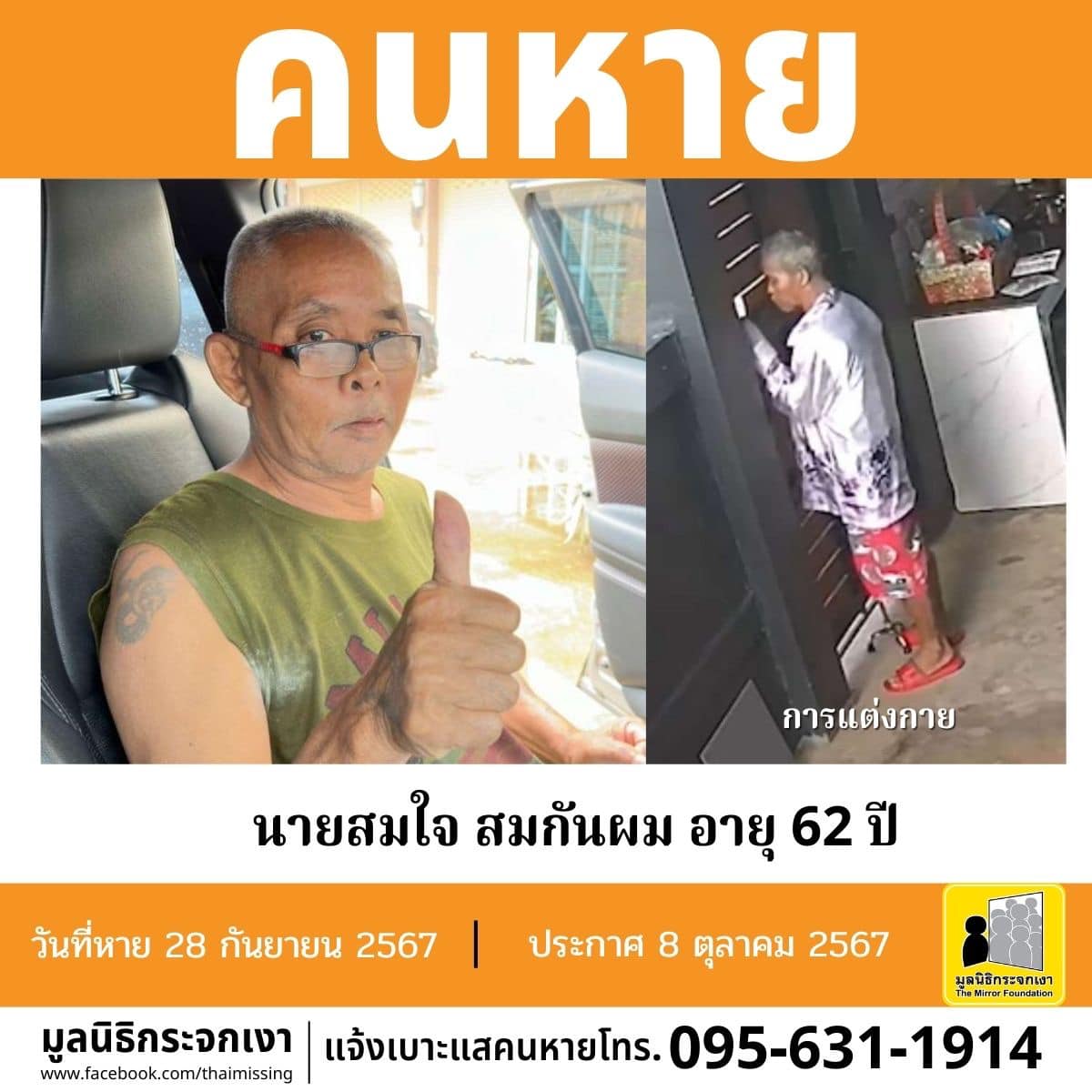 ชื่อ นายสมใจ สมกันผม หรือ ใจ อายุ 62 ปี หายออกจากบริเวณหมู่ที่4 บ้านหนองปลิง ตำบลไชยมงคล อำเภอเมืองนครราชสีมา จังหวัดนครราชสีมา เมื่อวันที่ 28 กันยายน 2567 เวลาประมาณ 08.07 น.