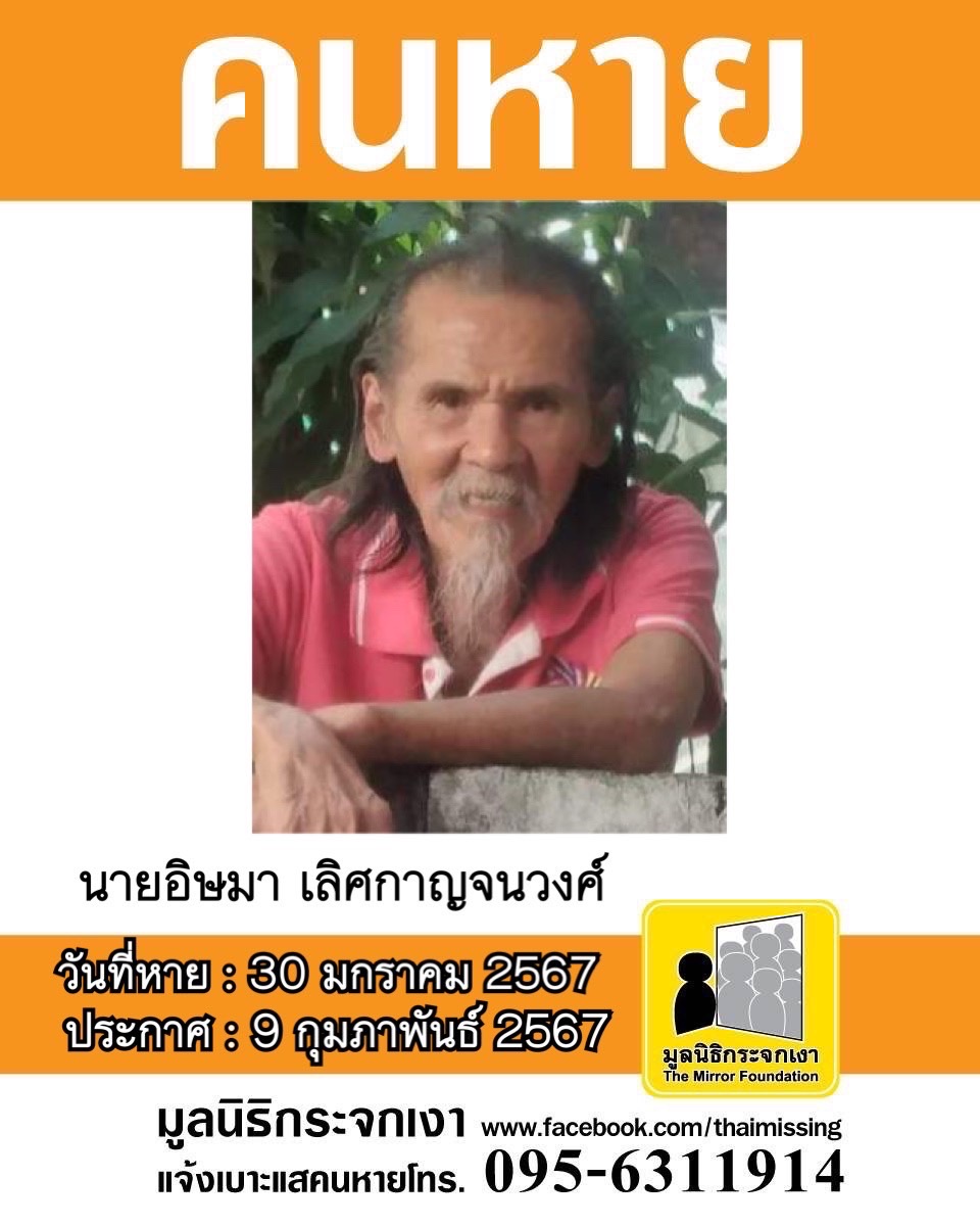 ชื่อ นายอิษมา เลิศกาญจนวงศ์ หรือ สายัน อายุ 66 ปี หายออกจากบริเวณการเคหะธนบุรีพระราม 2 ซอย 69 แขวงแสมดำ เขตบางขุนเทียน จังหวัดกรุงเทพมหานคร เมื่อวันที่ 30 มกราคม 2567 เวลาประมาณ 02:00 น.