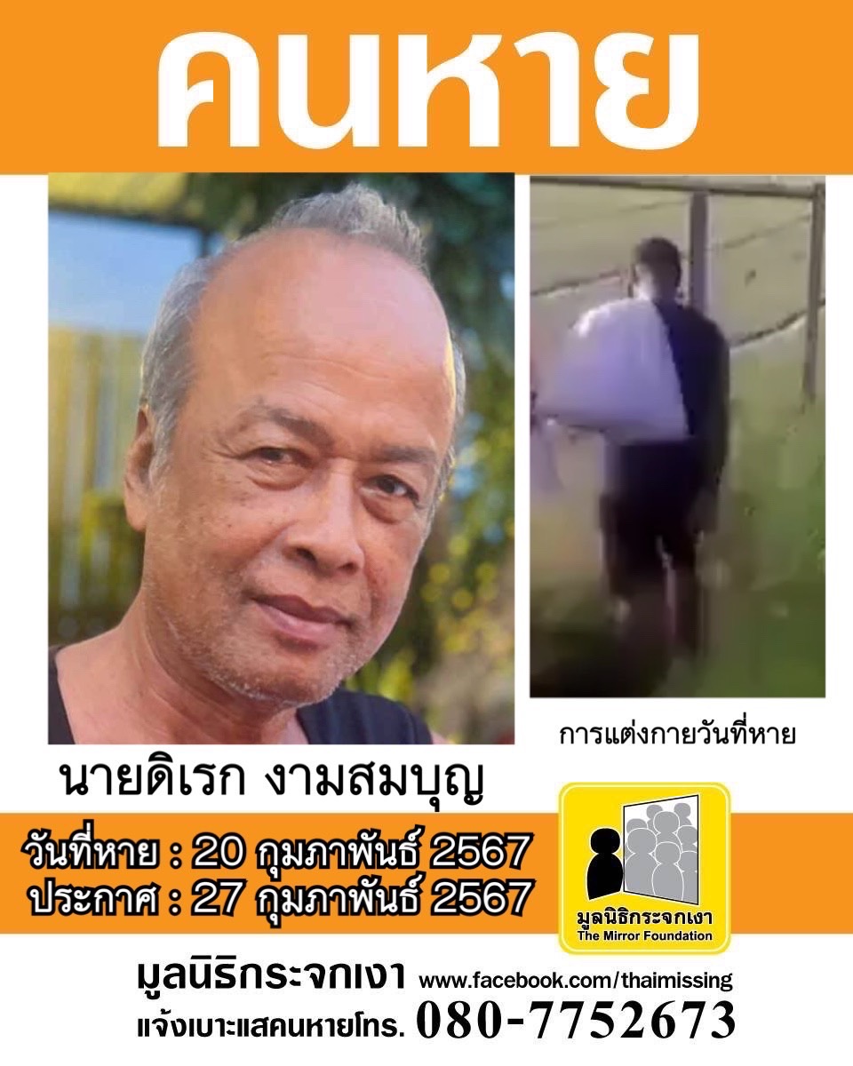 ชื่อ นายดิเรก งามสมบุญ หรือ ดิเรก อายุ 61 ปี หายออกจากบริเวณหมู่ที่ 12 ตำบลบ้านหีบ อำเภออุทัย จังหวัดพระนครศรีอยุธยา เมื่อวันที่ 20 กุมภาพันธ์ 2567 เวลาประมาณ 07:50 น.