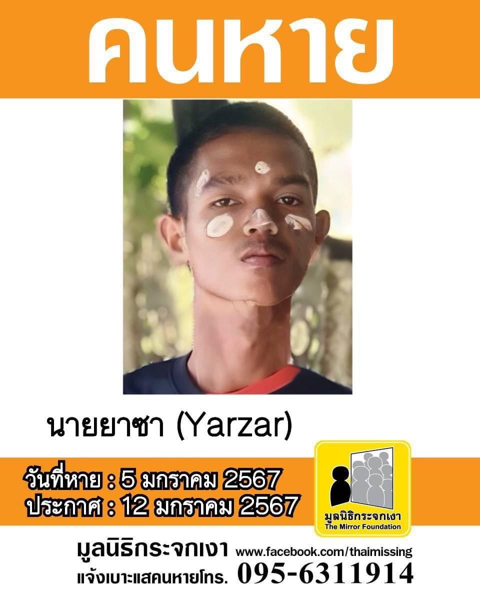 ชื่อ นายยาซา (Yarzar) หรือ มะทู อายุ 17 ปี (ชาวเมียนมาร์) หายออกจากบริเวณซอยท่าข้าม 13 เขตบางขุนเทียน แขวงแสมดำ กรุงเทพมหานคร เมื่อวันที่ 5 มกราคม 2567 เวลาประมาณ 21:00 น.
