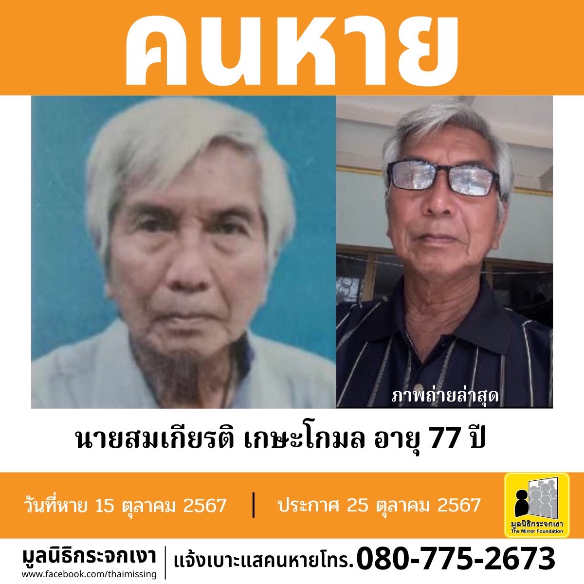 ชื่อ นายสมเกียรติ เกษะโกมล หรือ เกียรติ อายุ 77 ปี หายออกจากบริเวณซอยสุขุมวิท 65 แขวงพระโขนงเหนือ เขตวัฒนา กรุงเทพมหานคร เมื่อวันที่ 15 ตุลาคม