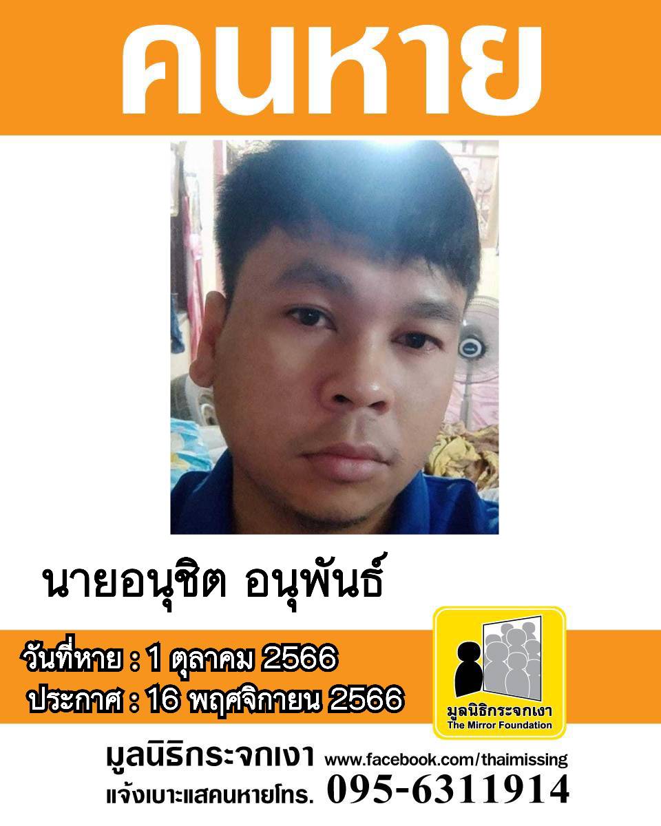 ชื่อ นายอนุชิต อนุพันธ์ หรือ เบ๊น อายุ 27 ปี หายออกจากบริเวณหมู่ที่ 6 ตำบลโนนรัง อำเภอเมืองร้อยเอ็ด จังหวัดร้อยเอ็ด เมื่อวันที่ 1 ตุลาคม 2566 เวลาประมาณ 19:10 น.