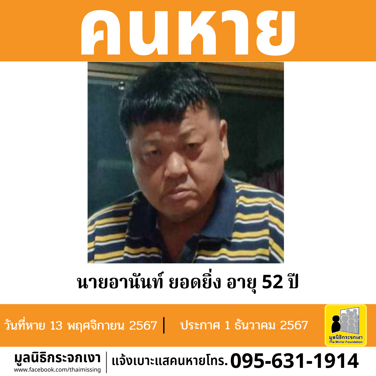 ชื่อ นายอานันท์ ยอดยิ่ง อายุ 52 ปี หายออกจากบริเวณหมู่ที่ 1 ตำบลสำโรงเหนือ อำเภอเมืองสมุทรปราการ จังหวัดสมุทรปราการ เมื่อวันที่ 13 พฤศจิกายน 2567